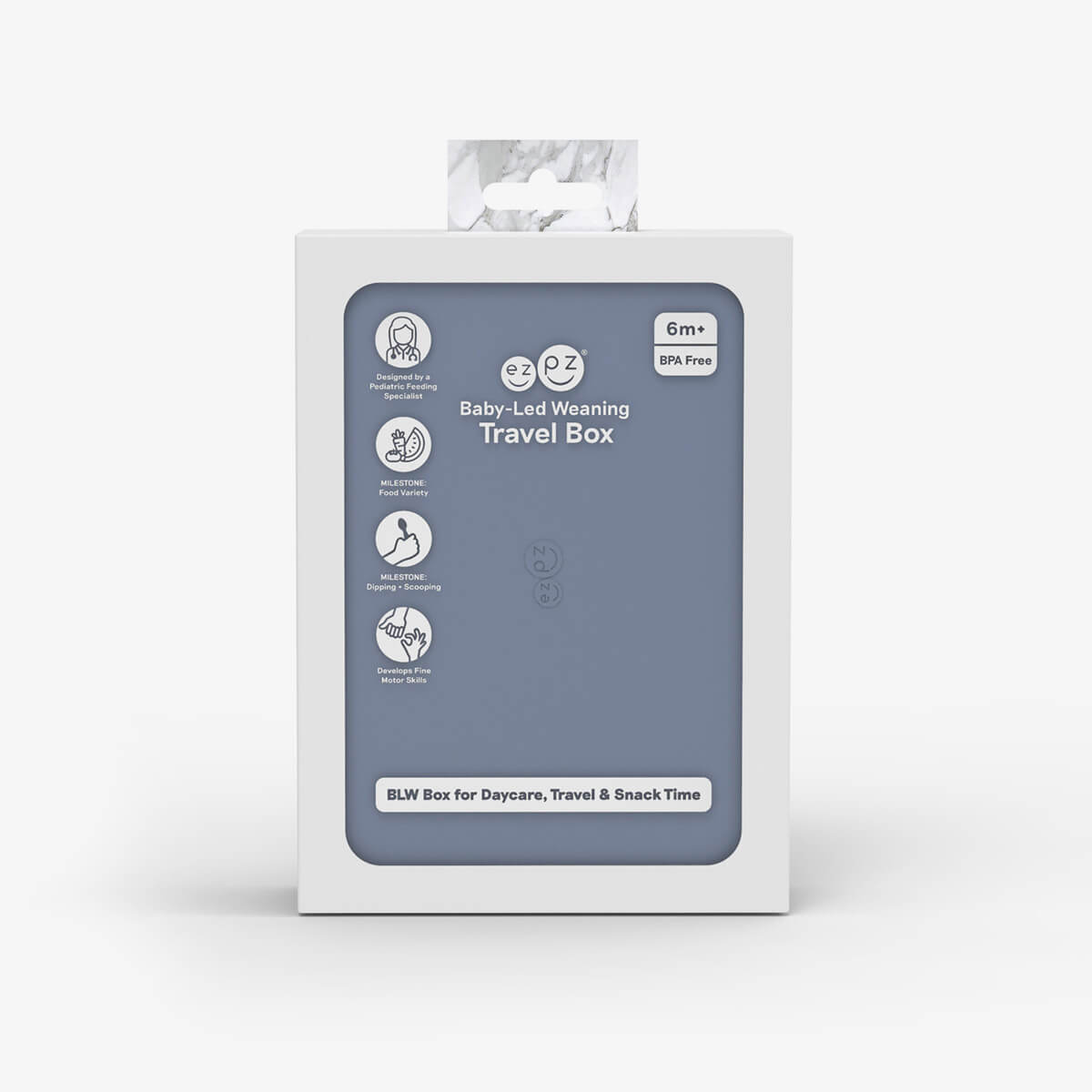 The travel box is an all-in-one feeding + storage system that helps families pack, transport, and serve baby’s meals when away from home. With designated spots for food strips, cubes, and purees, it supports self-feeding routines wherever baby goes (including daycare, restaurants, and more). Contents not included.