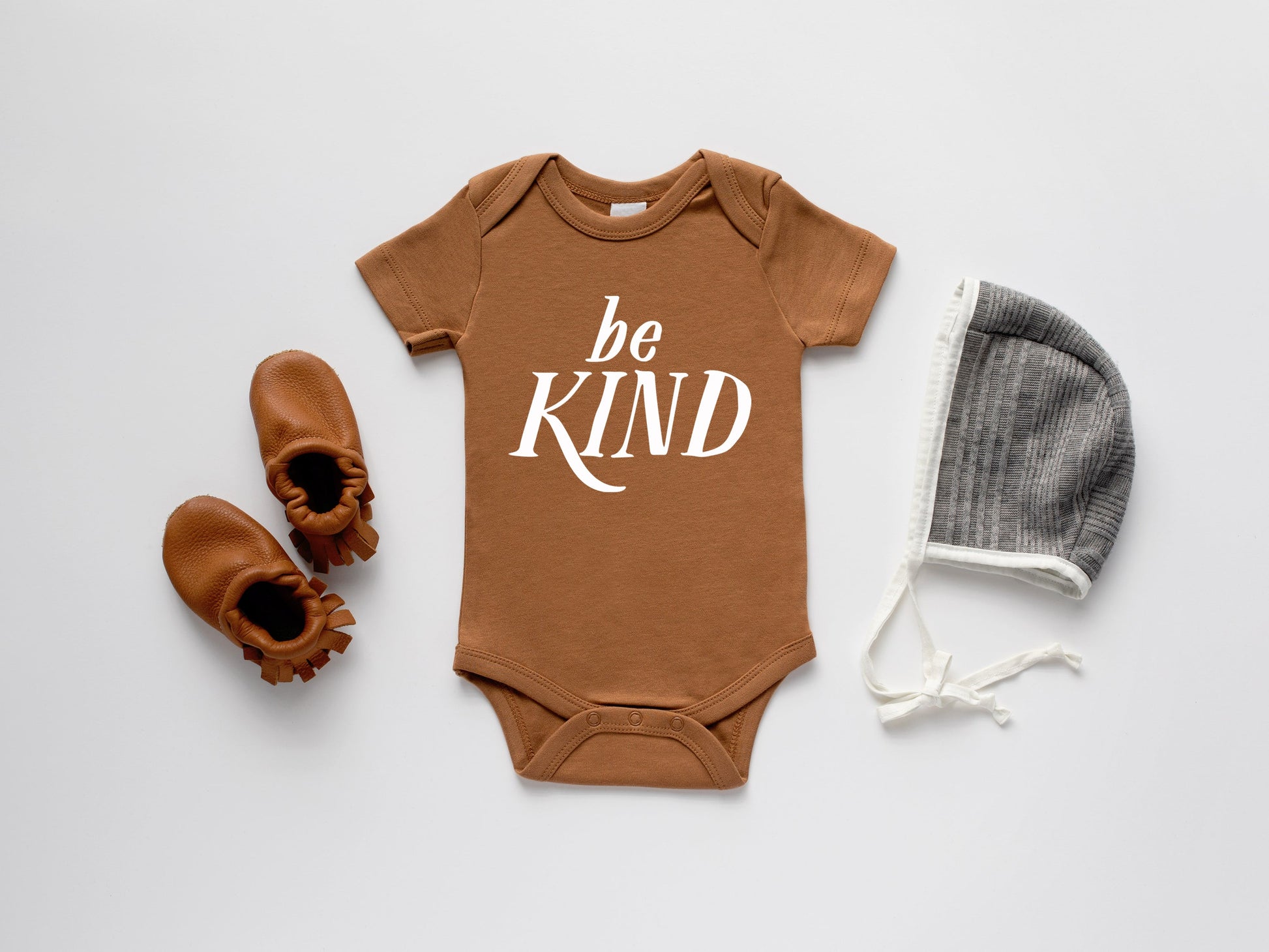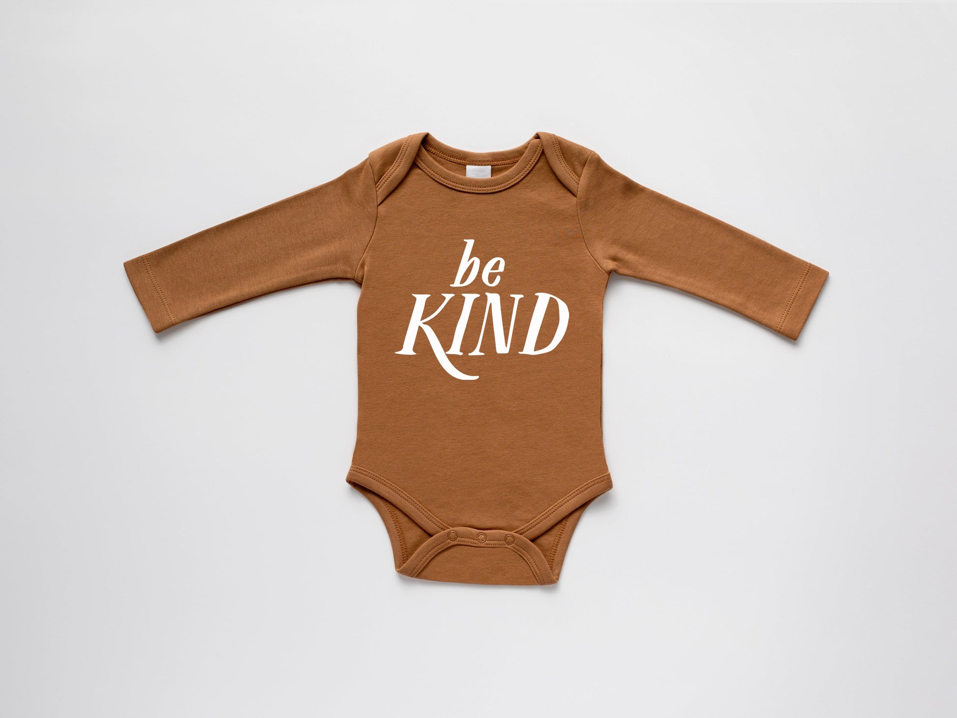 Celebrate kindness in style! This super-soft, 100% organic cotton outfit features modern typography on a luxe cream, gray, or camel colored bodysuit - designed with love and screen printed in-house. Short and long sleeve options.