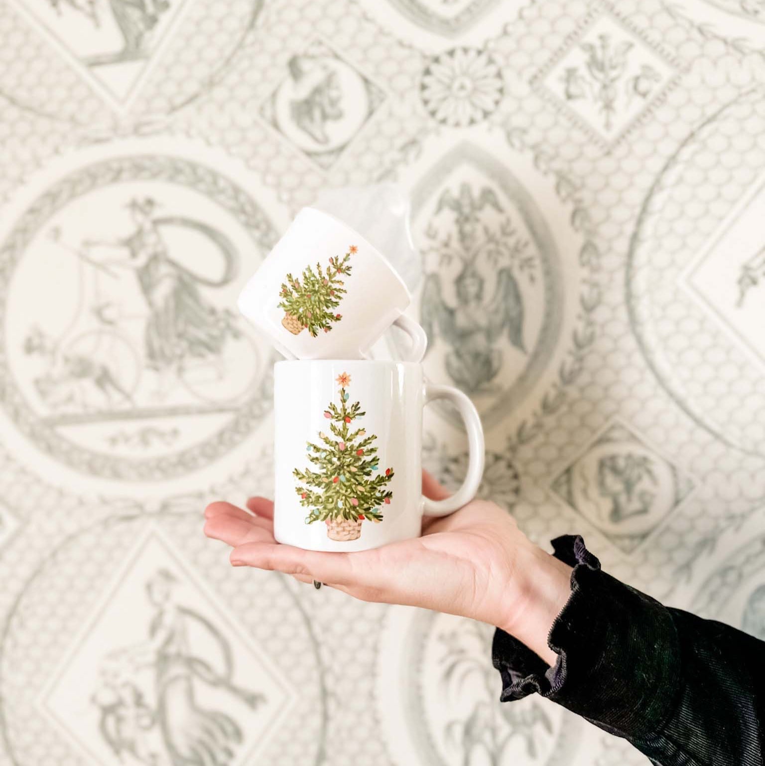 This holiday favorite features a hand-painted, classic Christmas tree tucked sweetly into a woven basket—full of warmth, tradition, and just the right amount of festive charm. Perfect for sipping hot cocoa, morning coffee, or your favorite holiday tea all season long.