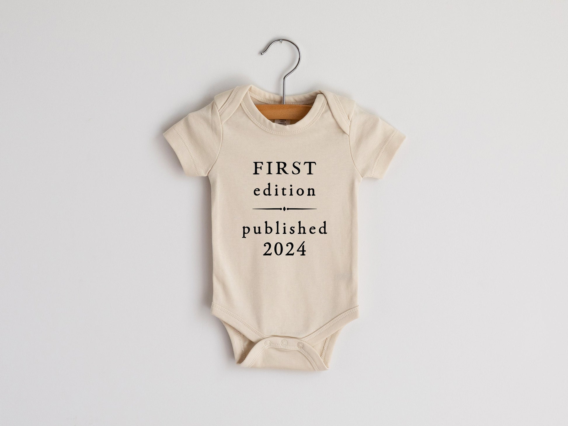 A sweet typographic bodysuit inspired by vintage book pages, to announce your little one in style. This super-soft baby outfit features modern typography on a luxe bodysuit that’s designed with love and screen printed in-house. Camel and cream fabric are 100% organic. Gray is a cotton-poly blend.