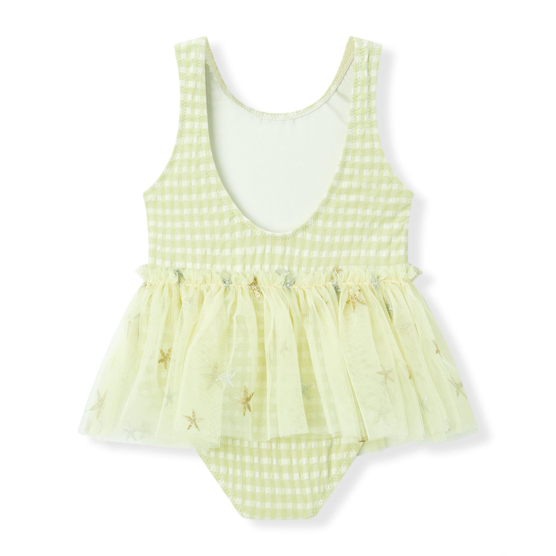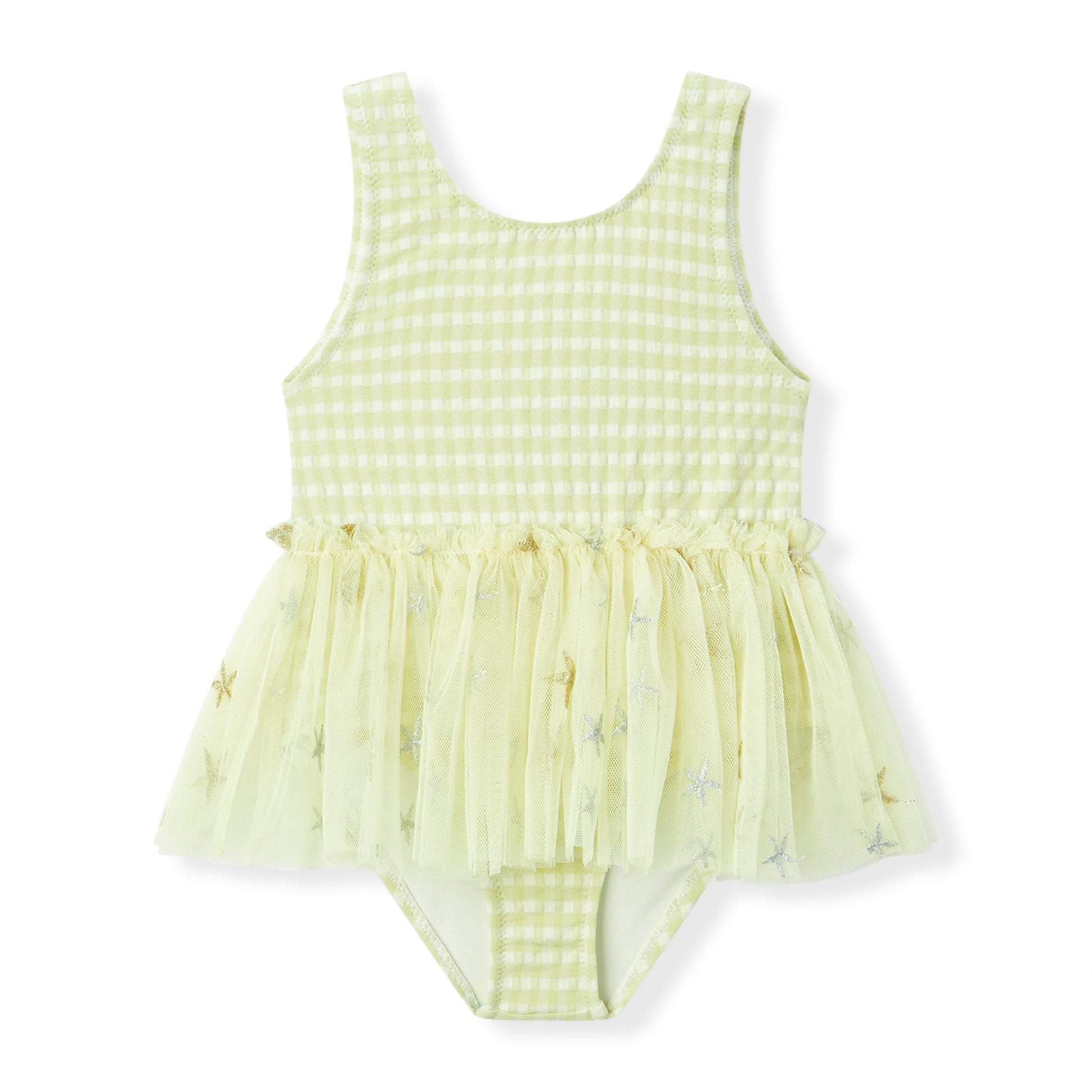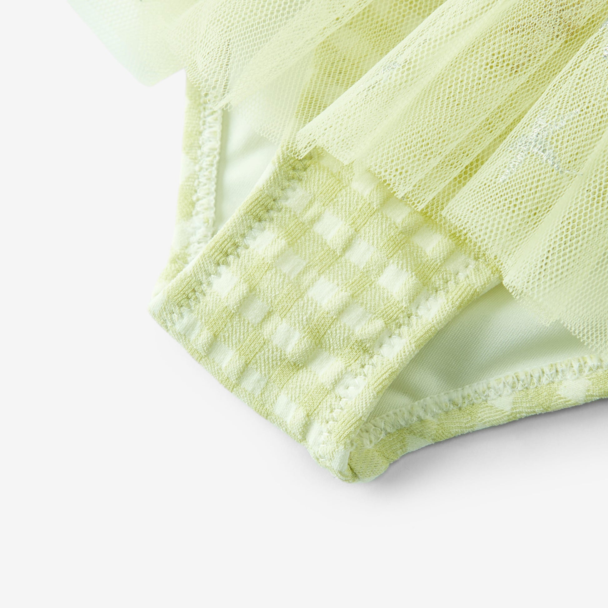 Your little ballerina will love twirling in our Ballet Skirt Swimsuit in the Green Gingham print. Made from a fade-resistant blend of 87% nylon, 13% spandex, and sun protection of UPF 50+, this practical and adorable swimsuit is perfect for pool parties and beach play.