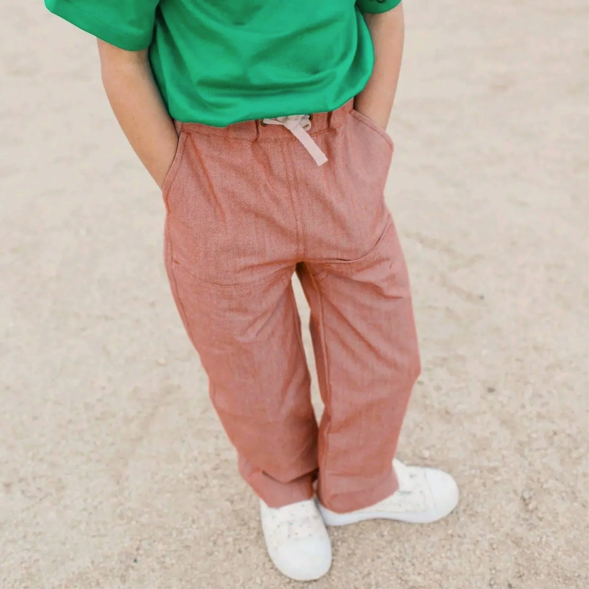 The Jules Pants in Orange Chambray are a versatile wardrobe essential for spring, fall, and summer days. Made from midweight organic cotton chambray, these pants are breathable, durable, and soft against the skin. With a relaxed fit, adjustable waistband, and extra leg length for rolling up or down, they’re designed to move and grow with your child—perfect for everyday adventures across three seasons.