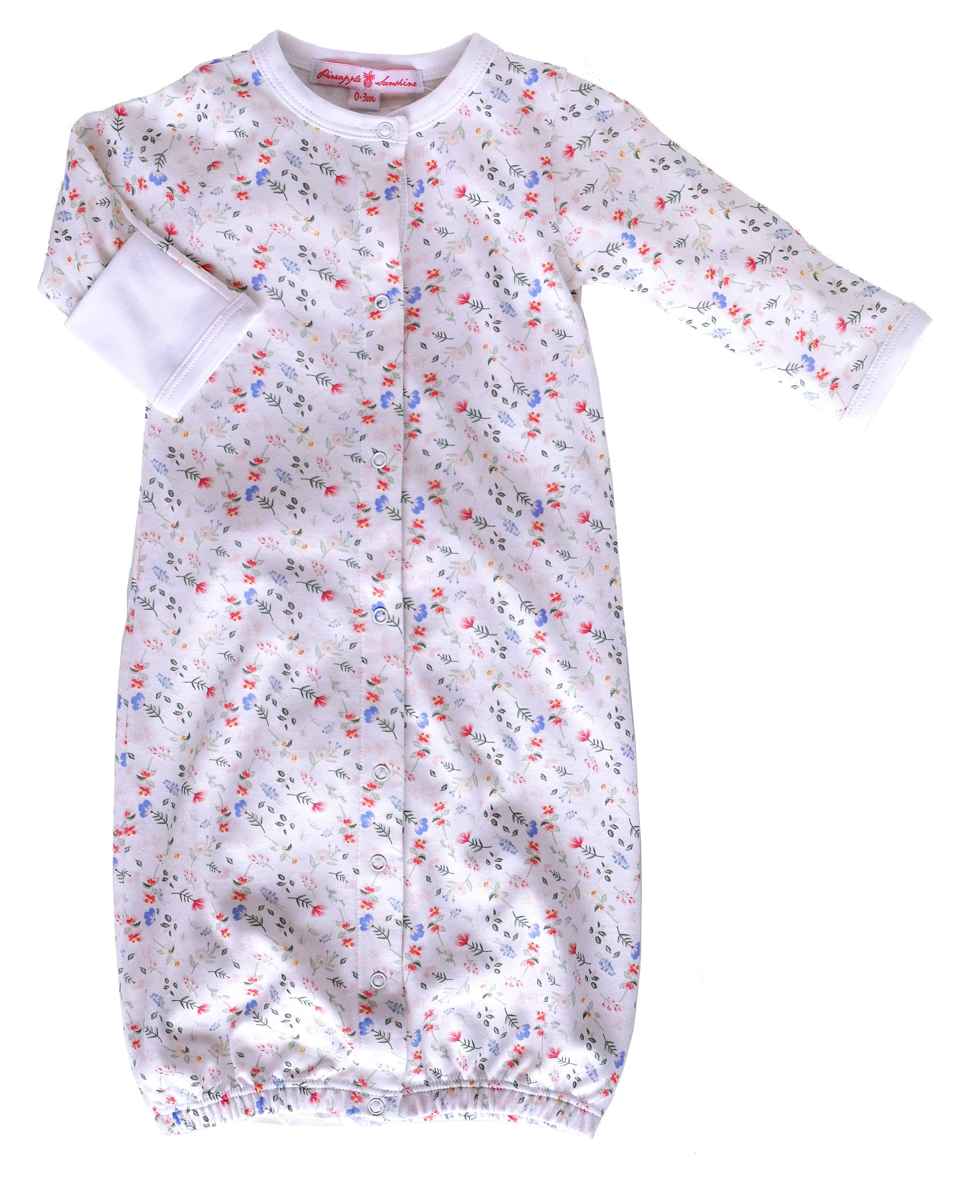 Made from the softest pima cottons, this converter quickly snaps from a gown into a romper. A matching blanket is also available for the perfect newborn gift! Create a registry by going to the home page and clicking on "Gift Registry" from the main menu. The Madison Floral collection offers a smocked dress, footie and girl's bubble also.