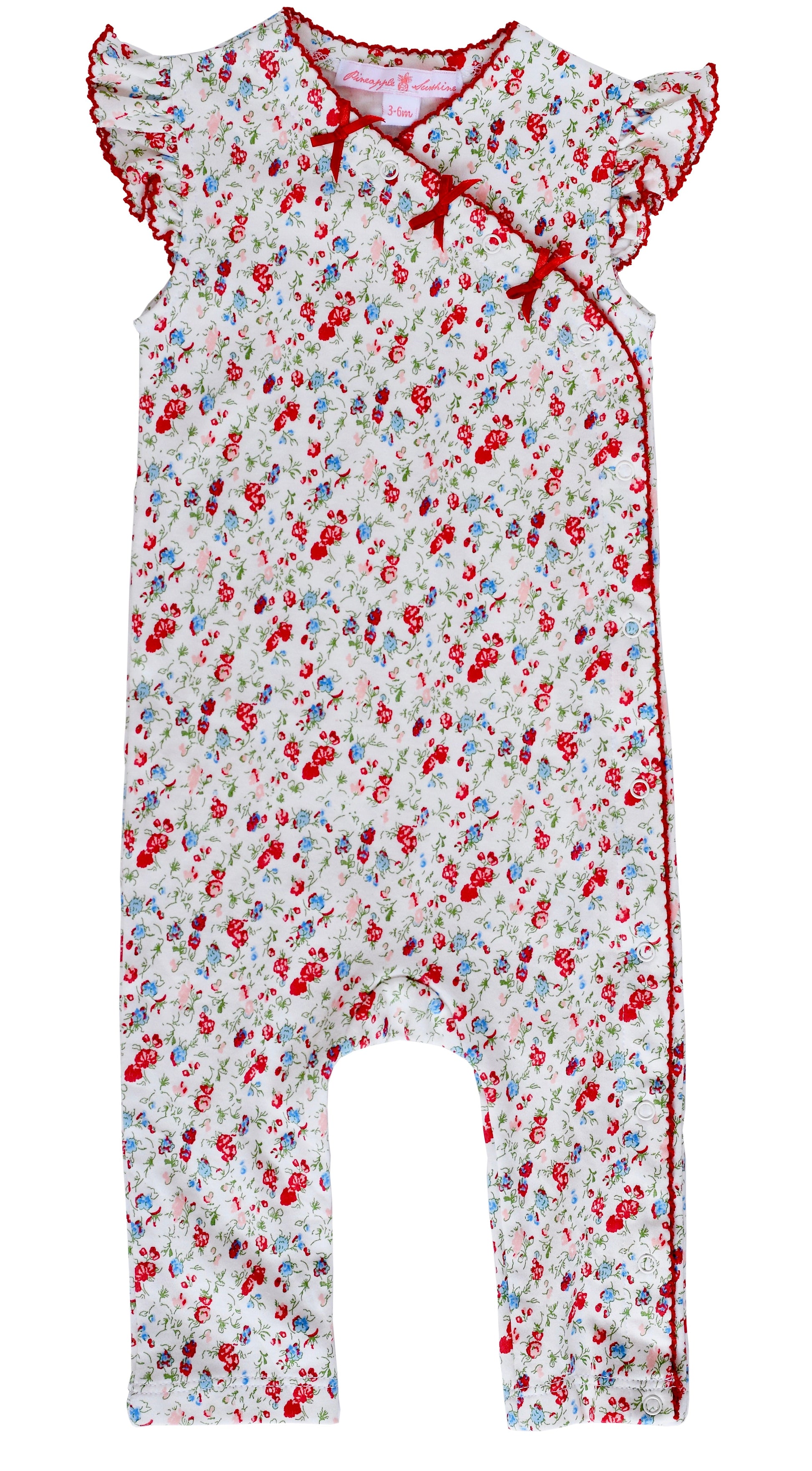 Made from the softest Pima cotton, this floral is perfect for a pop of color. Snap side closure for easy dressing. Bow details and picot trim details make this romper extra special.