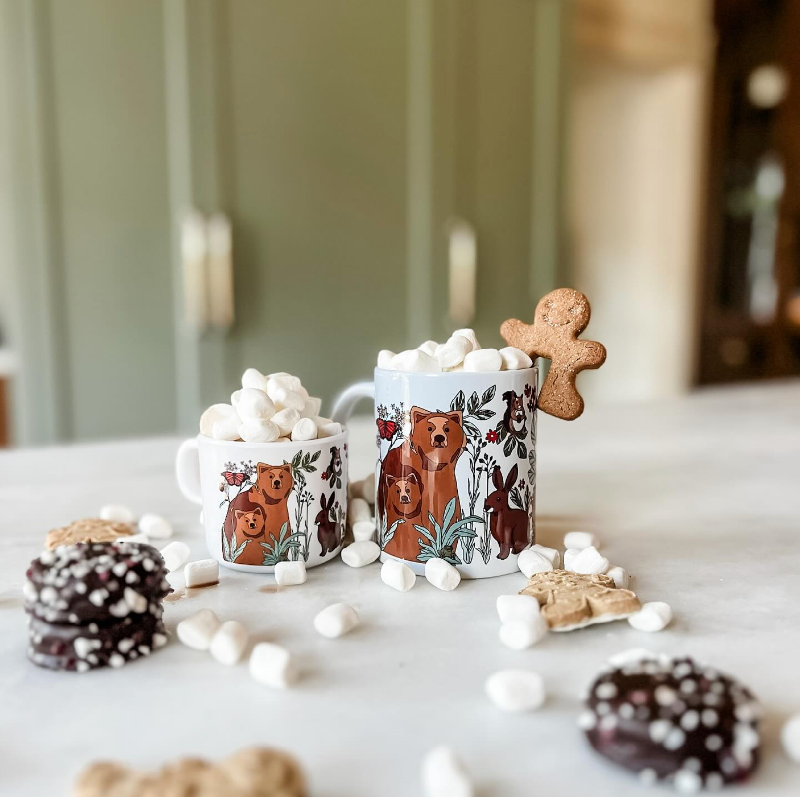 This matching mug and sippy cup set is perfect for the outdoorsy family who loves wildlife, fresh air, and a little mountain magic. Hand-illustrated woodland animals—think bears, bunnies, deer, and foxes—gather beneath soft evergreens in a pattern inspired by cozy cabin mornings and wild-hearted littles.