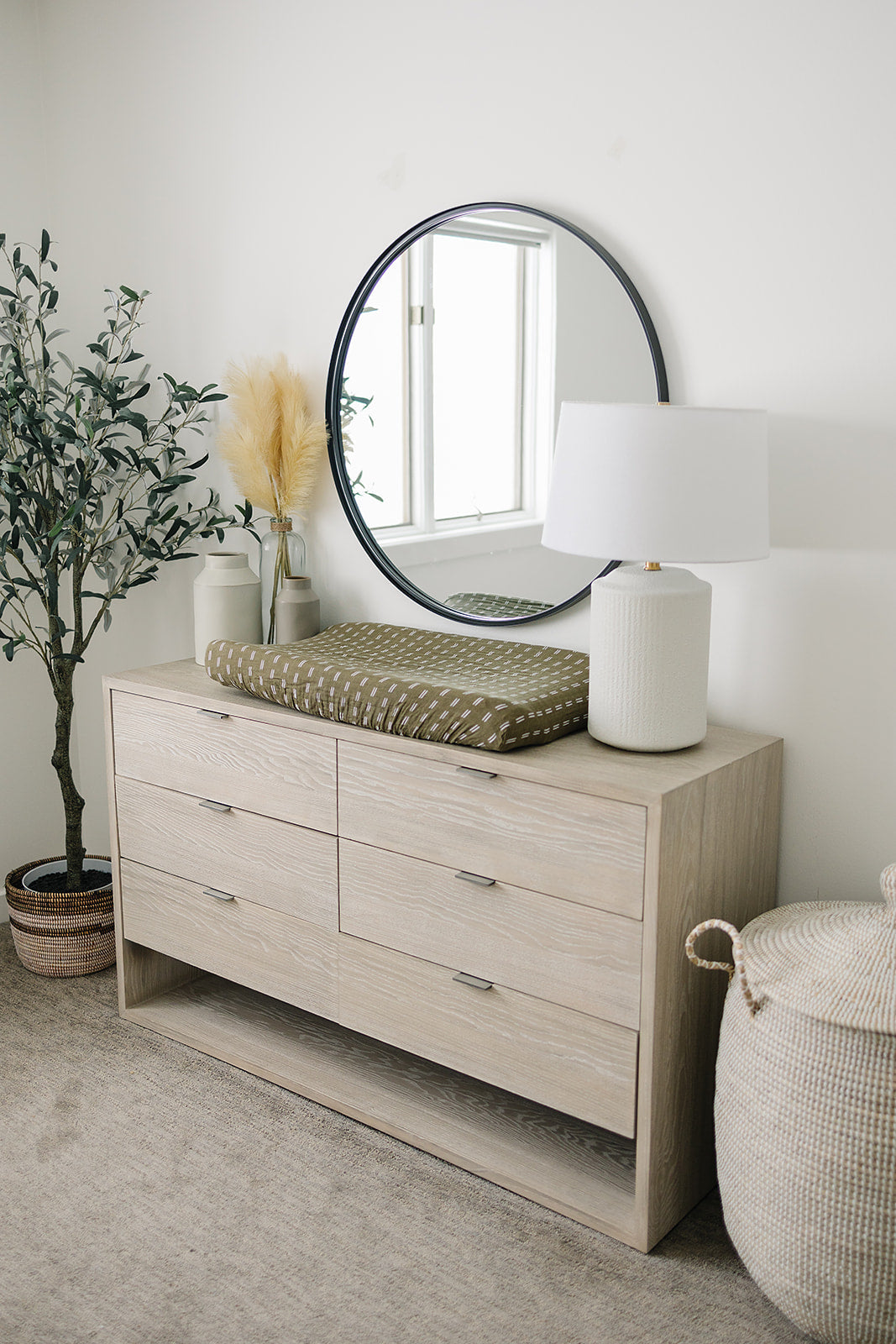 Transform your baby's changing area with our Olive Strokes Muslin Changing Pad Cover. Crafted from our exclusive designed fabric, this cover is not only soft and breathable but also easy to wash. The elasticized edges make it a breeze to put on and take off standard changing pads. Add a touch of style and comfort to your nursery with this versatile and practical changing pad cover.