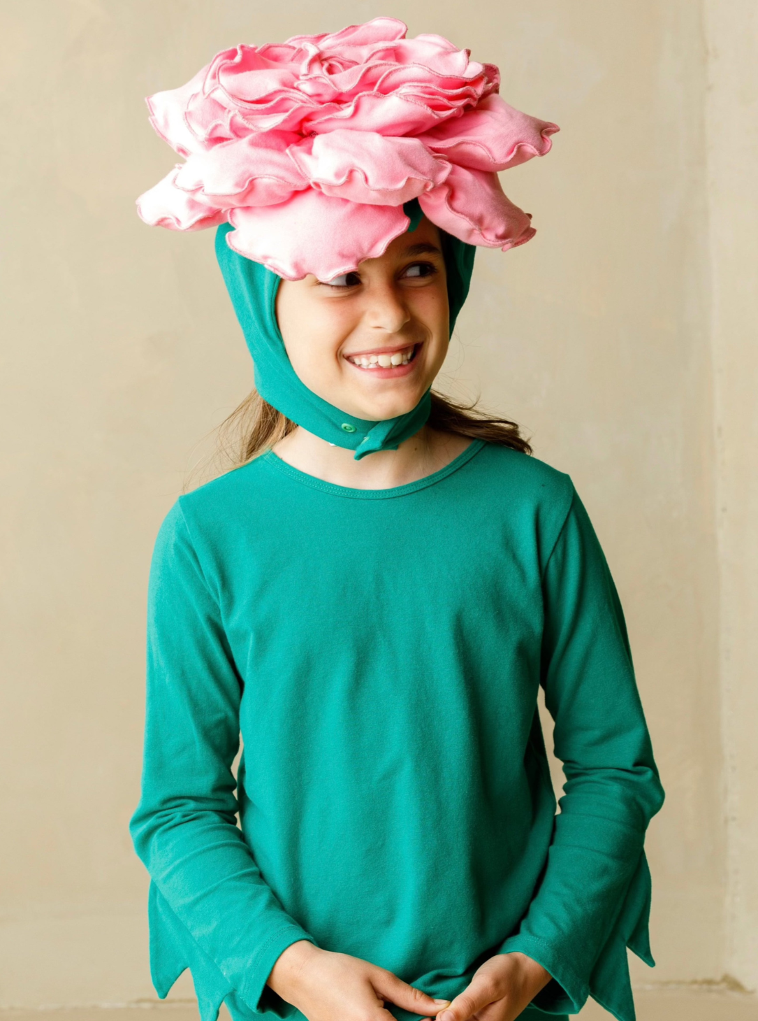 Transform into a magical flower fairy with this beautifully crafted costume. Featuring a stunning hand-sewn pink peony hat, this outfit is paired perfectly with green cotton pajamas that resemble stems with pointed thorns. The stretchy cotton fabric ensures comfort, while the intricate details create a stunning fairy look. Ideal for Halloween, birthdays, themed parties, or imaginative play, this unique ensemble is designed to captivate with its charm and beauty.