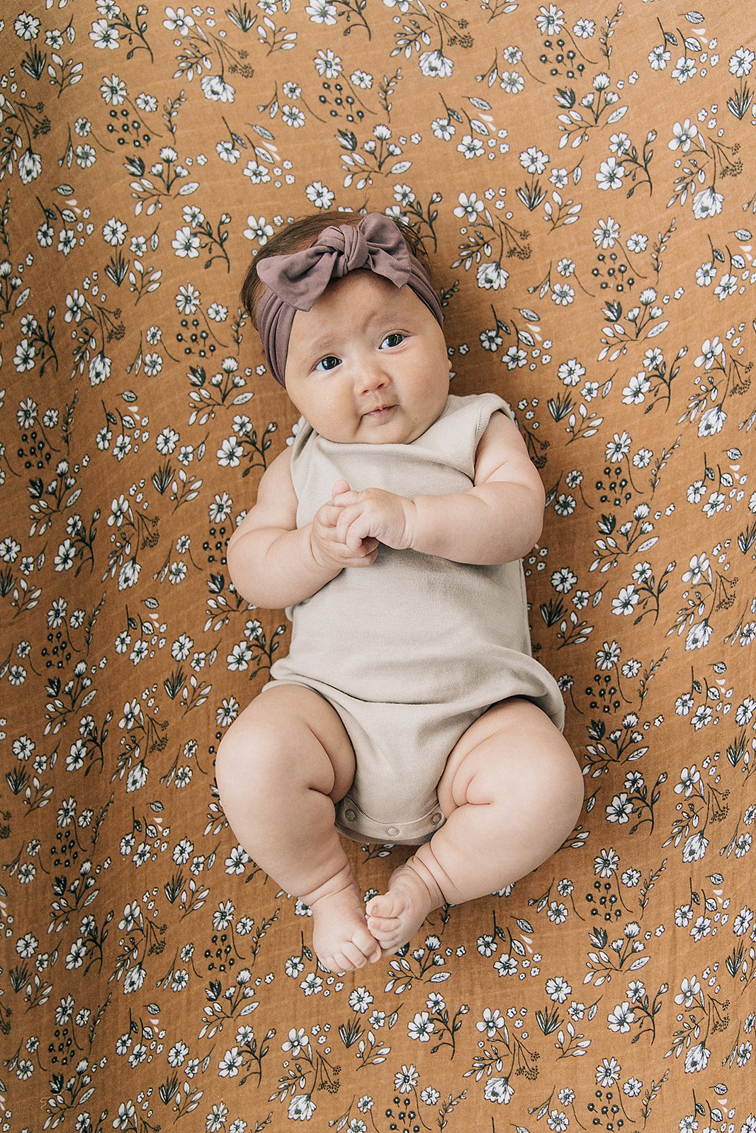 This is a one size head wrap that will fit size newborn and up. It is made out of a soft Bamboo Rayon. They are tied in a simple square knot making it easy to resize on your little ones head. We love how soft they are and the neutral designs they come in. They each have matching stretch knot gowns and swaddles in our shop.