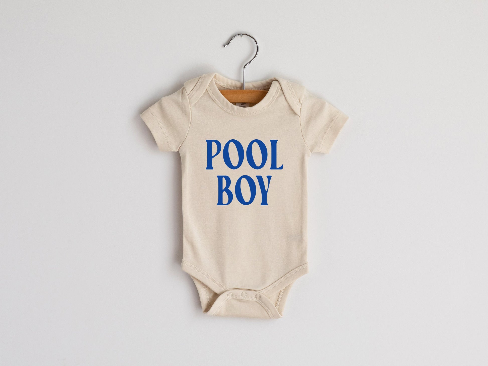 For your little water lover and poolside helper! This super-soft, 100% organic cotton outfit features modern typography in crisp blue ink on a cream colored bodysuit - designed with love and screen printed in-house. Short and long sleeve options. A perfectly punny play-on-words for little pool boys.