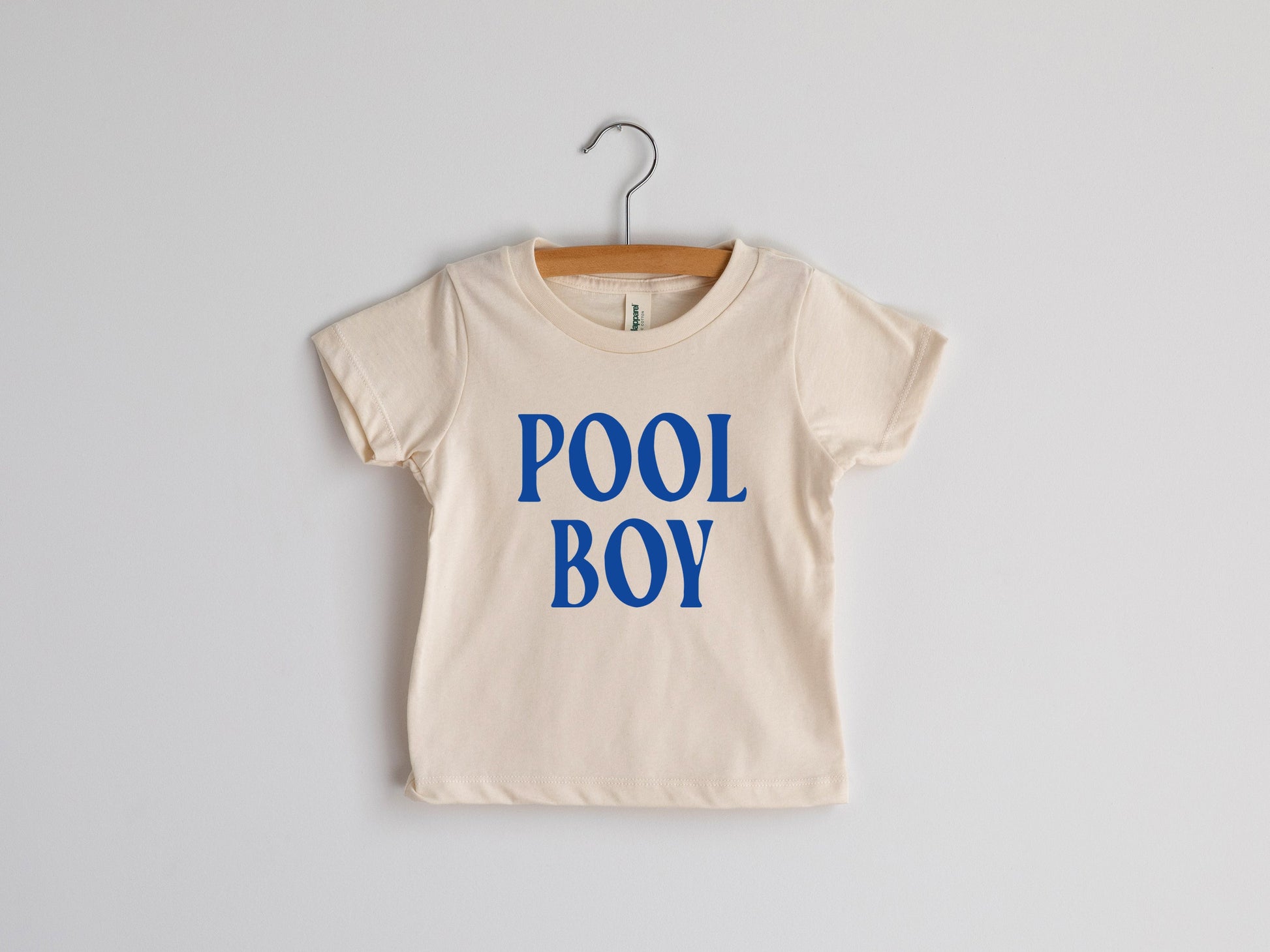 For your little water lover and poolside helper! This modern tee for little ones features a fun, groovy typeface and was designed with love and screen printed by hand in-house in crisp blue ink. Natural cream cotton is 100% organic and made in the U.S.A.. A perfectly punny play-on-words for little pool boys.