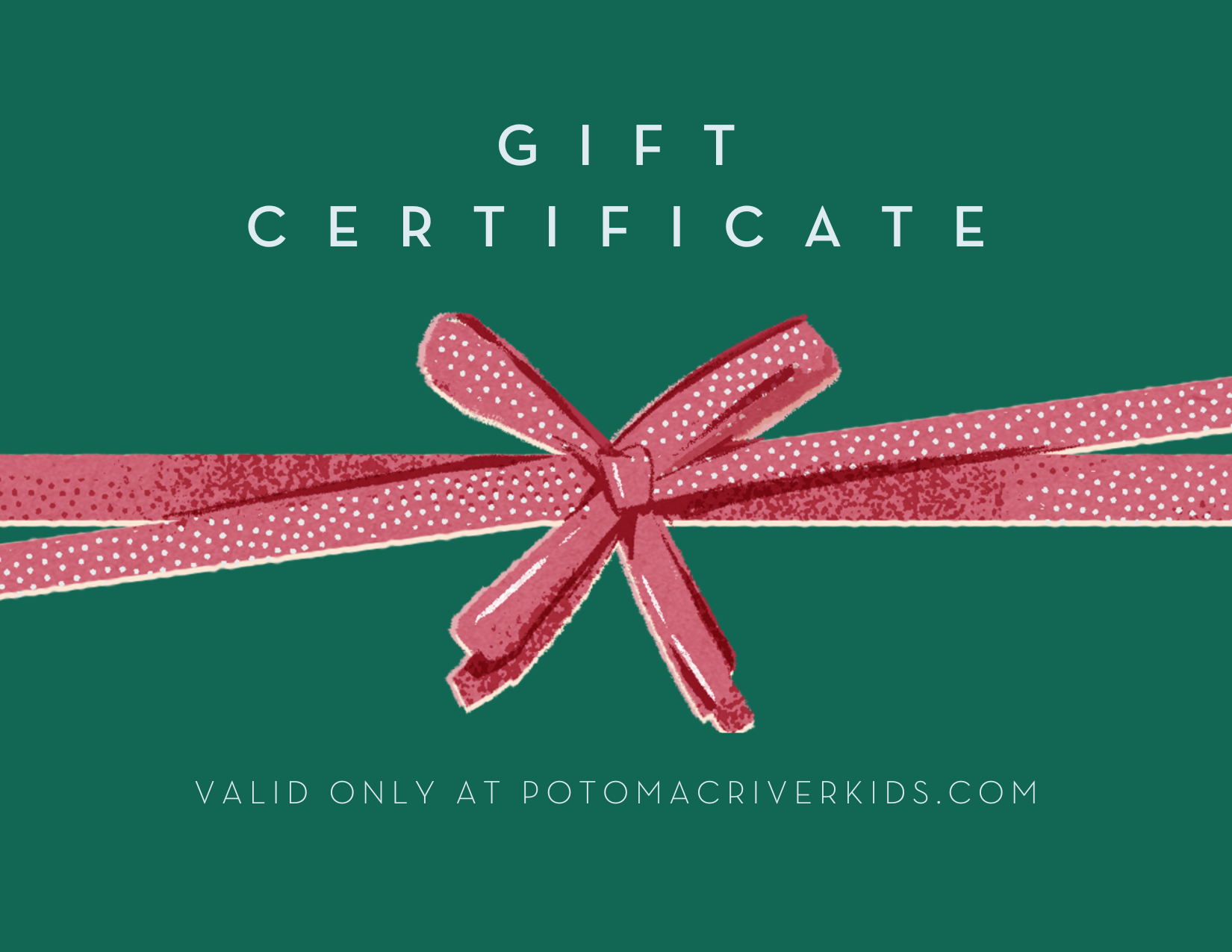 - Usage: Redeemable exclusively online at potomacriverkids.com. This gift card can not be used at our in person store front in the King Street Collective.