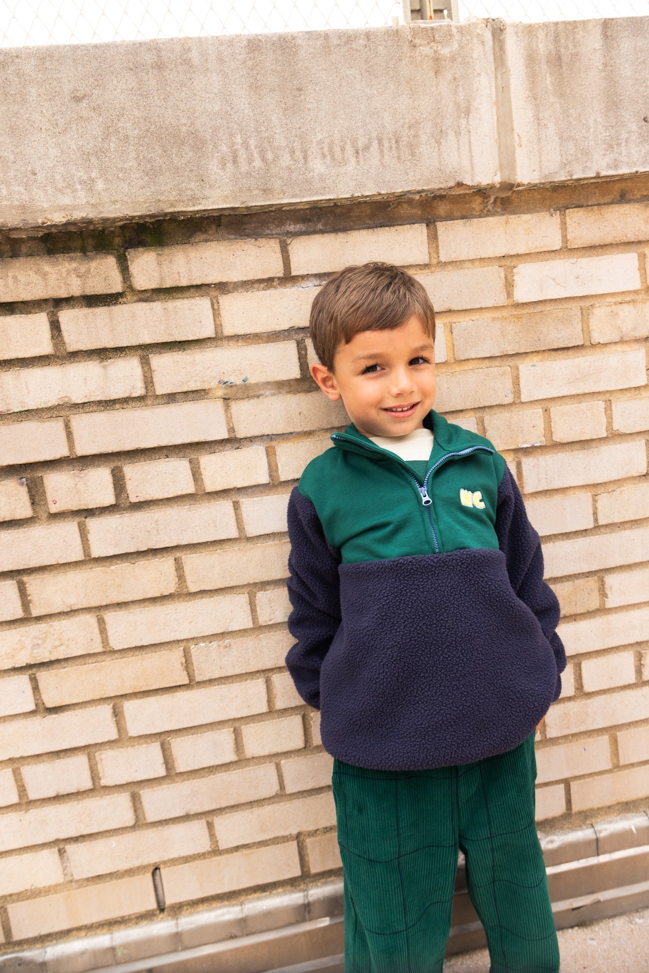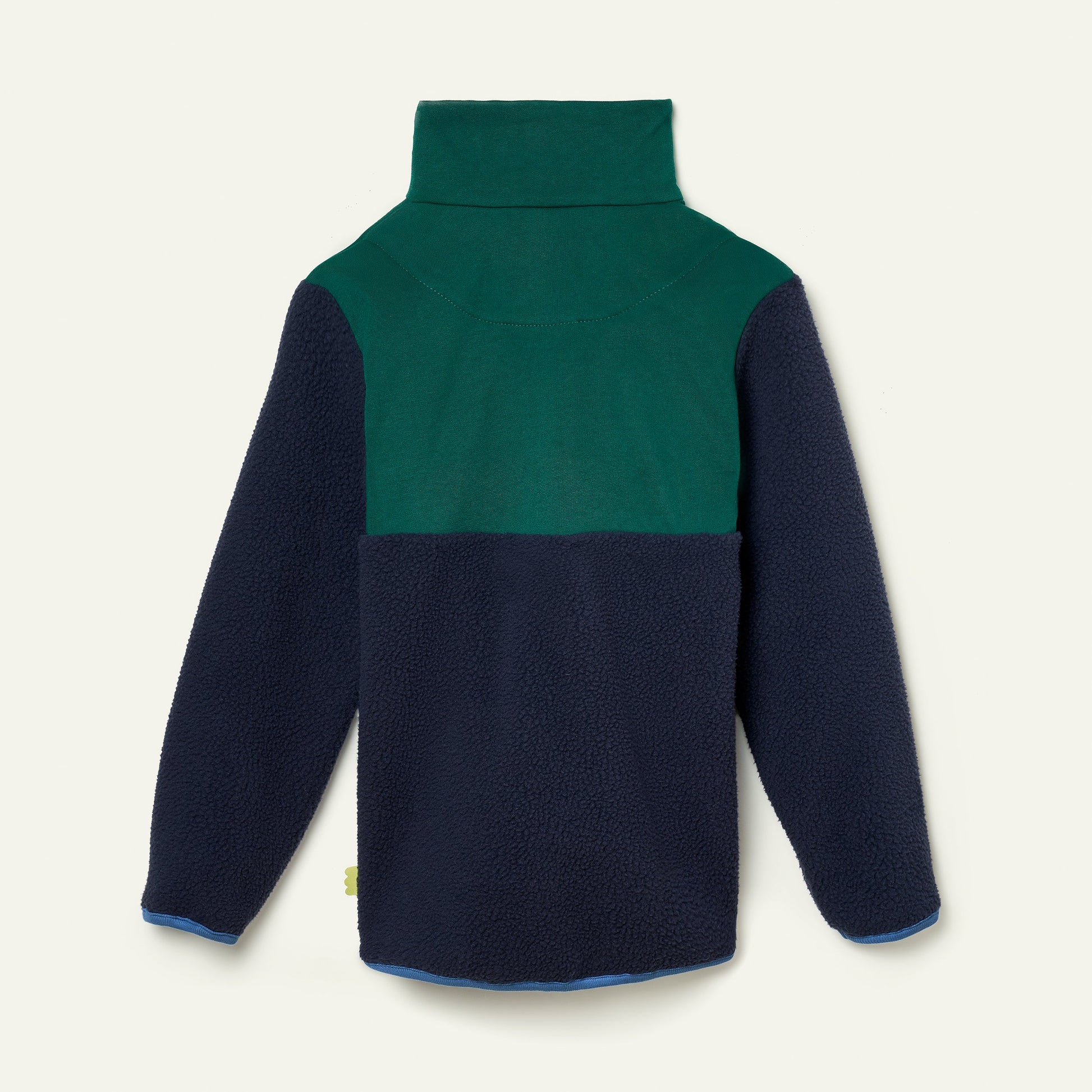 A cozy classic, our Navy Sherpa Zip up is made from a soft blend of recycled and organic cotton. With a bold navy and green colorblock design, plush sherpa texture, and easy half-zip closure, it’s the go-to layer for cool school days and weekend adventures.