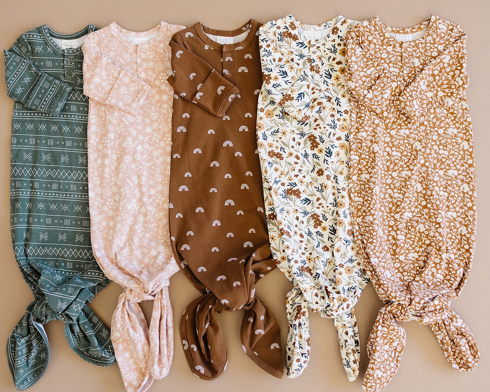 These gowns are size 0-3. They are made out of stunningly soft cotton to keep your little one comfortable. We have a variety of gender neutral designs and colors making them perfect for any baby. They have fold over hands and two snaps for easy on and off. We also have shoulder flaps to make it easily pull over your little ones head, we want to make dressing your baby as easy as possible. The bottom is easily tied and untied in a knot for no-fuss diaper changes which makes it a newborn baby essential!