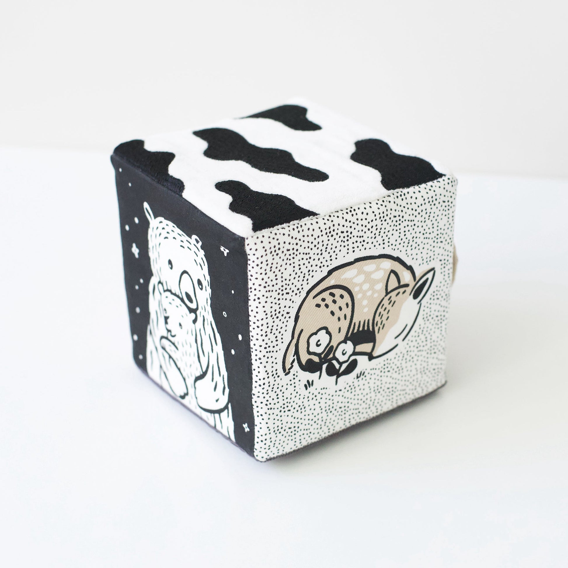 Bears, lambs, and a sleepy owl! So much to do and see in one interesting block. This soft fabric block is designed to delight baby's developing senses with high-contrast graphics, textures, grippy tags, and crinkles. With artistically designed scenes and patterns displaying the world of baby animals.