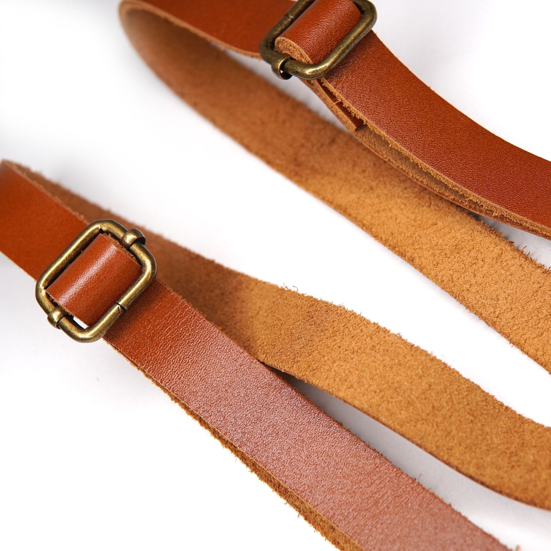- Real Genuine leather, tanned and smooth on the front and raw on the inside so they stay put on shoulders. comfortable and convenient.