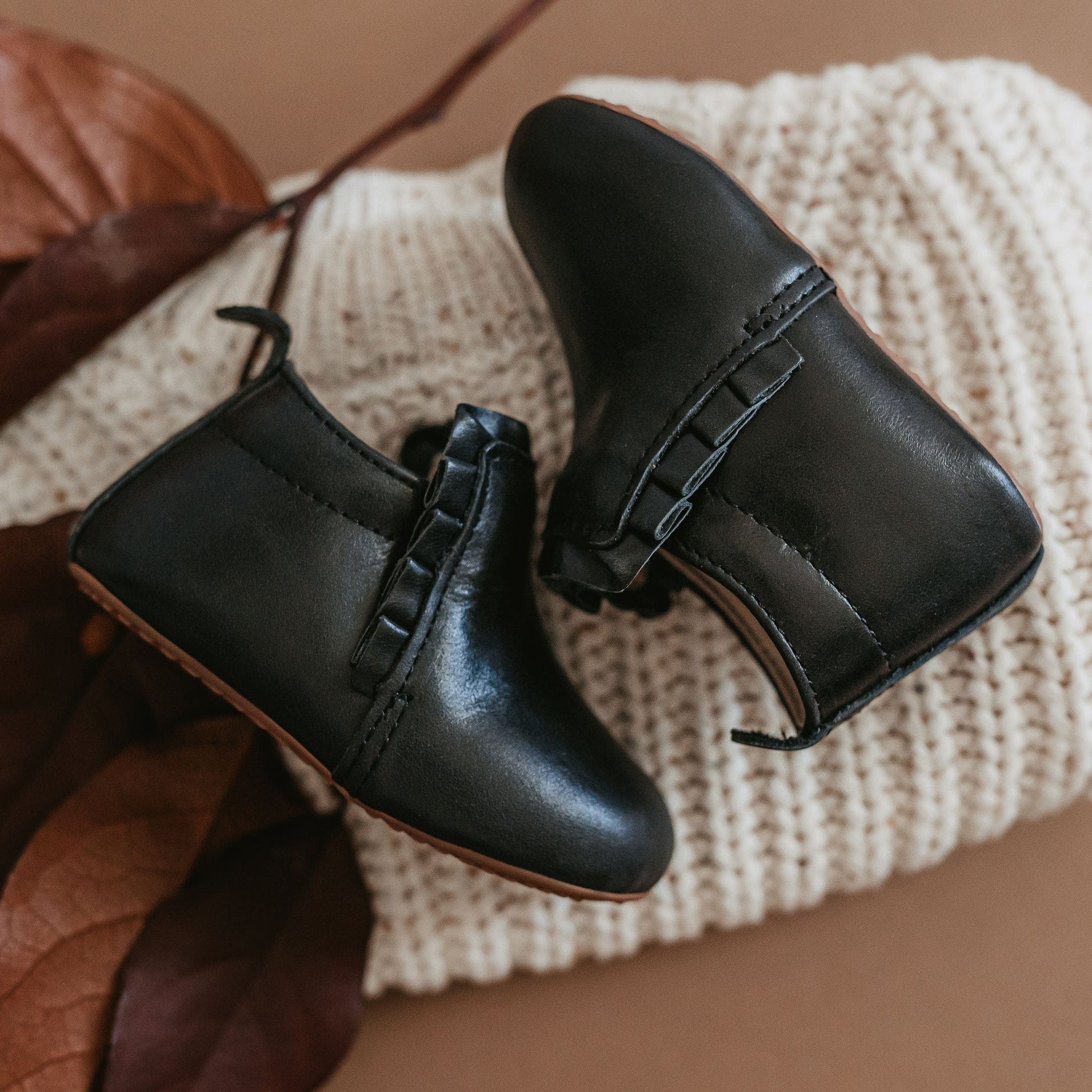 Sizes 5–13 feature our barefoot sole. Sizes 2–4 include our original non-slip soft soles—intentionally designed to support the earliest stages of walking. The leather sole in these smaller sizes allows for the most natural movement and optimal foot development.