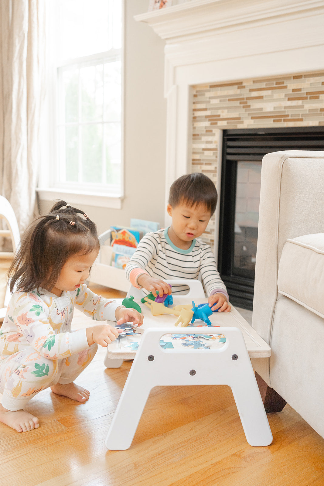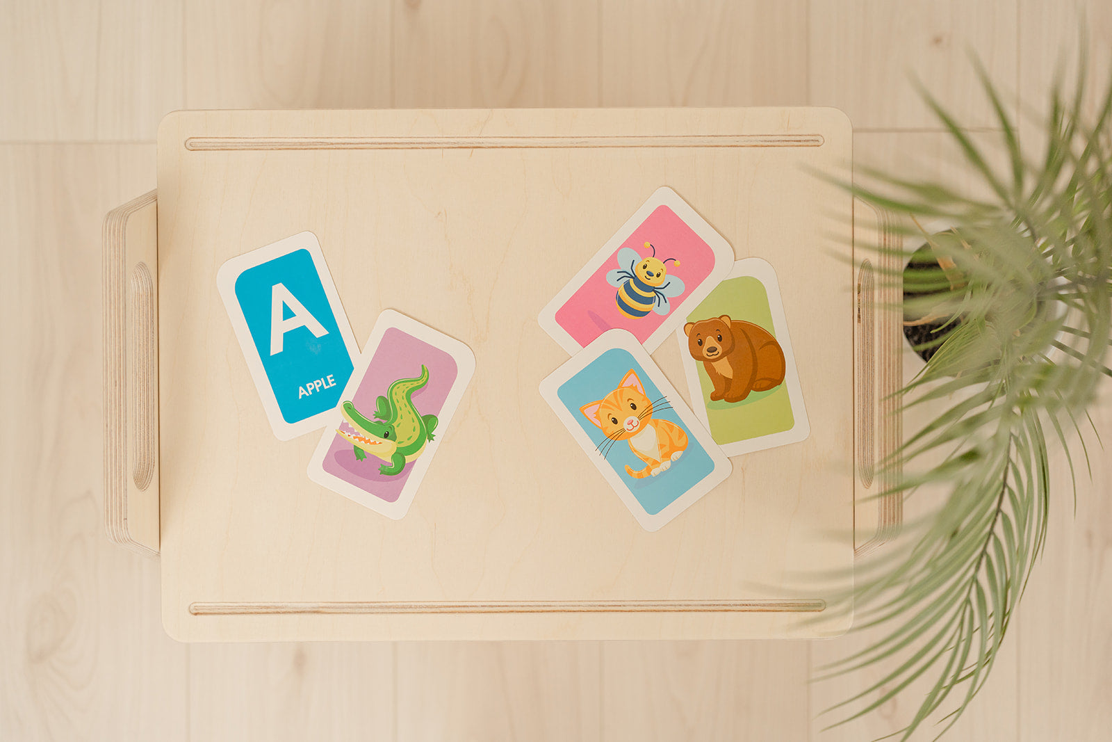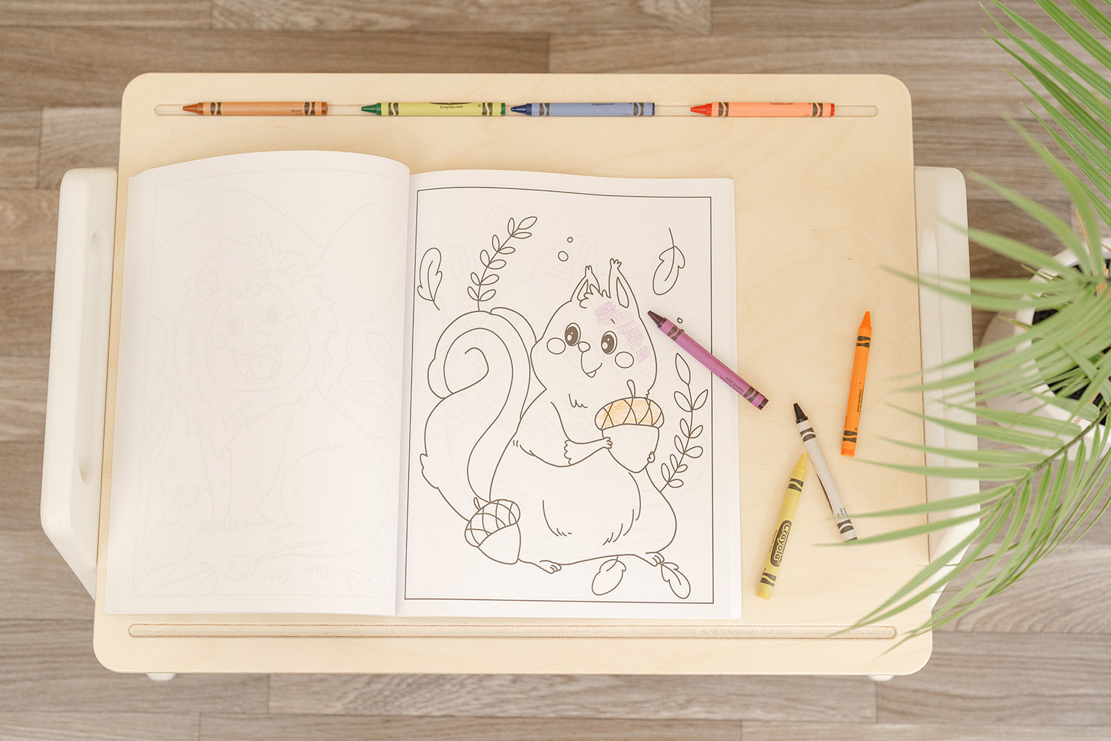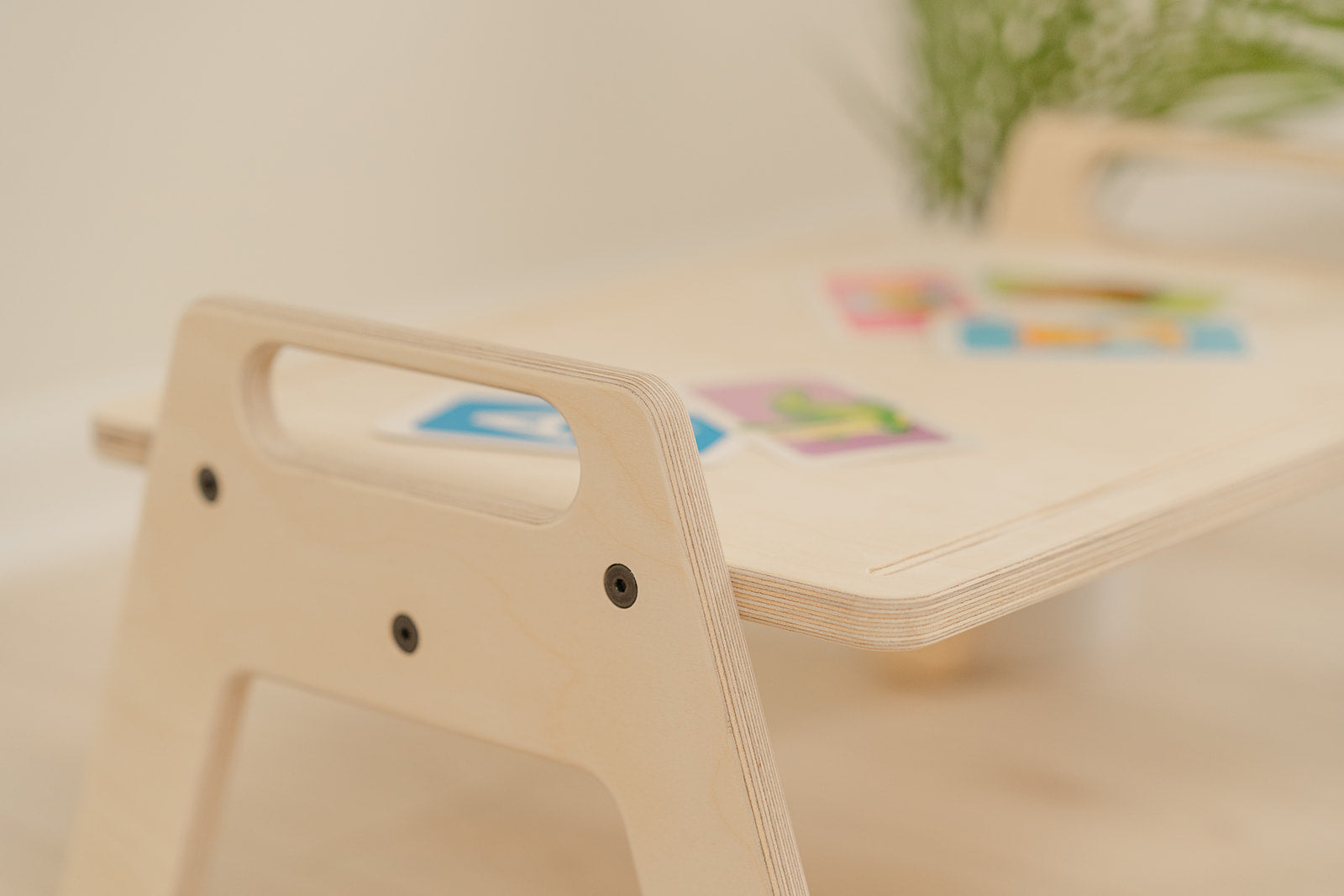 The Montessori-Inspired Activity Tray is a small table that is mobile and can be placed anywhere for little ones to have their own play area. Perfect for sensory play, coloring books, setting up tea parties, or playing with Blueberry and Third's Activity Rainbow/Rocketship Boards!