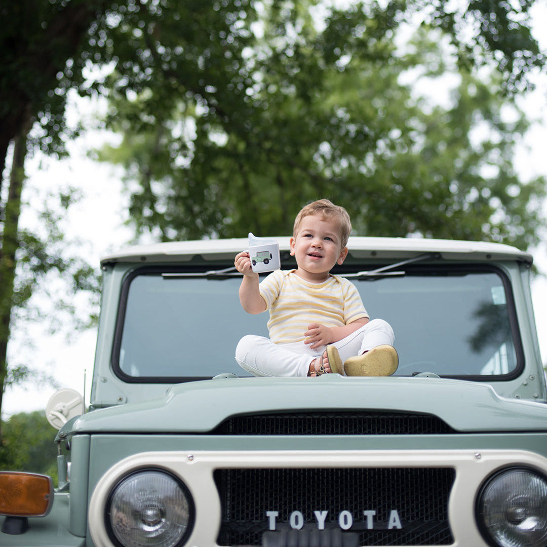 Coordinating mug for Dada (or anyone really!) and sippy cup for babe featuring a classic Landcruiser FJ40 in mint green. Helmsie's Creative Director, Karla, illustrated this truck inspired by her husband's dream car that now sits in their driveway. Every child, and most Dad friends, want to take it for a spin when they visit. Mamas and Dadas alike will appreciate it's sweet color and classic Americana appeal.