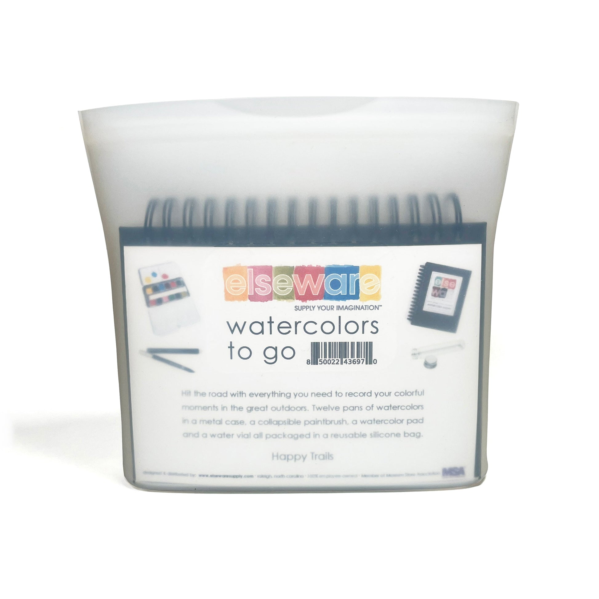 Hit the road with everything you need to record your colorful moments in the great outdoors. Twelve pans of watercolors in a metal case, a collapsible paintbrush, a watercolor pad and a water vial all packaged in a reusable silicone bag. Happy Trails!