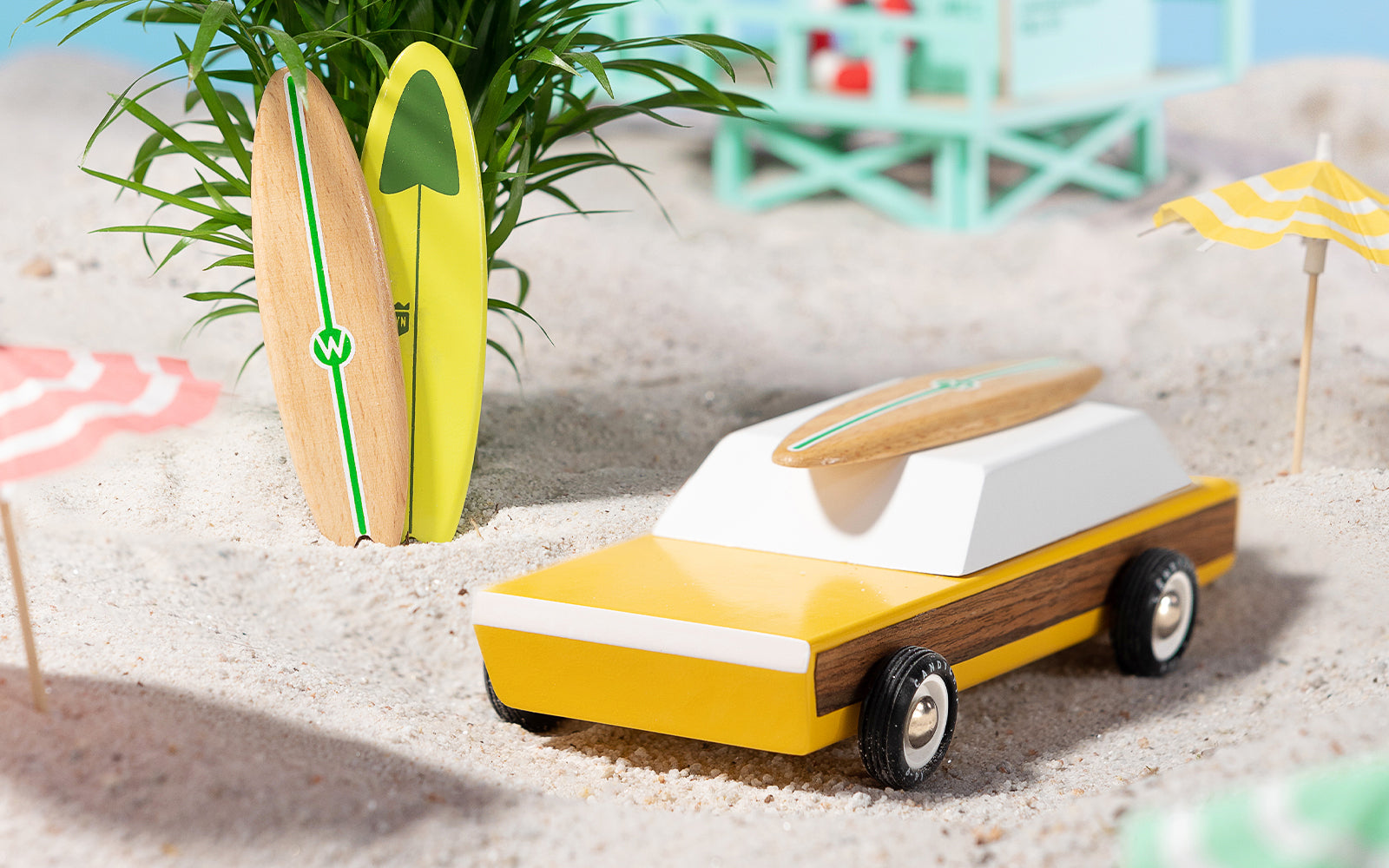 The most classic of the classics, this is what legends are made of. With real walnut veneer-paneled sides and a magnet embedded in the roof, it comes with a surfboard that snaps onto it. This car also features a magnetic tow hook—allowing it to hitch our equally awesome trailer.
